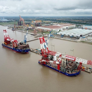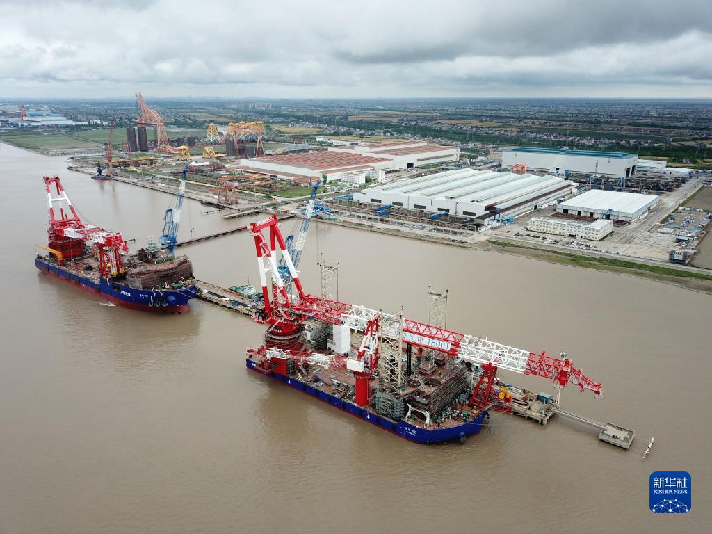 5月19日在江苏省南通市启东海工船舶工业园拍摄的上海振华重工启东海洋工程股份有限公司,和该公司建设中的4000吨全回转起重船(左)和1800吨风电安装平台(无人机照片)。
