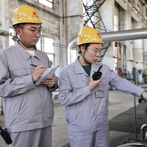 日前,邓晶(右一)和同事在车间巡检。(付卫峥摄)