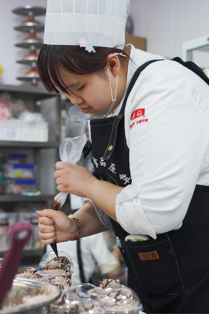 患有肢体残疾的侯丹是善满烘焙成熟的面点师,她正在研究制作低糖饼干和蛋糕。“我们也能用实力说话,把产品卖好,就特别有成就感。”侯丹说。