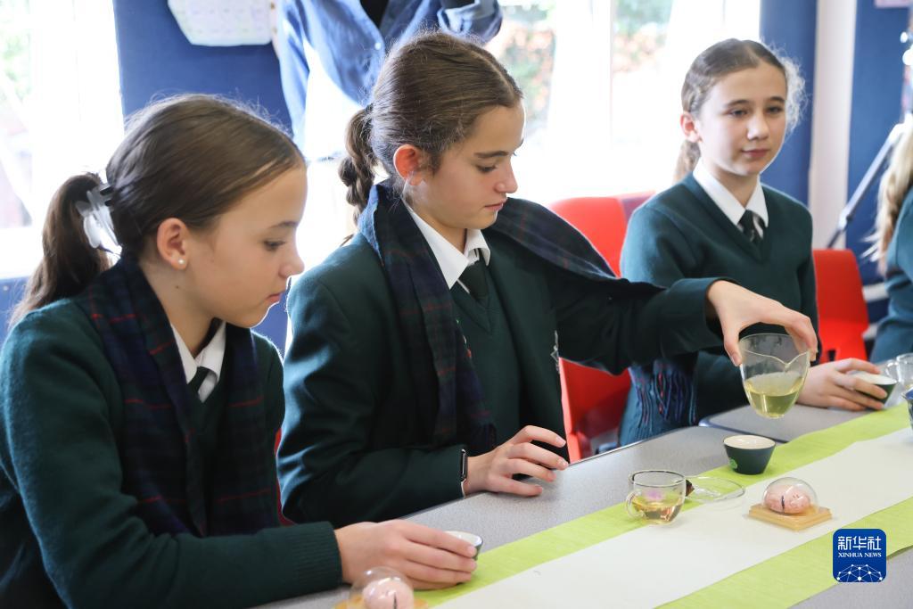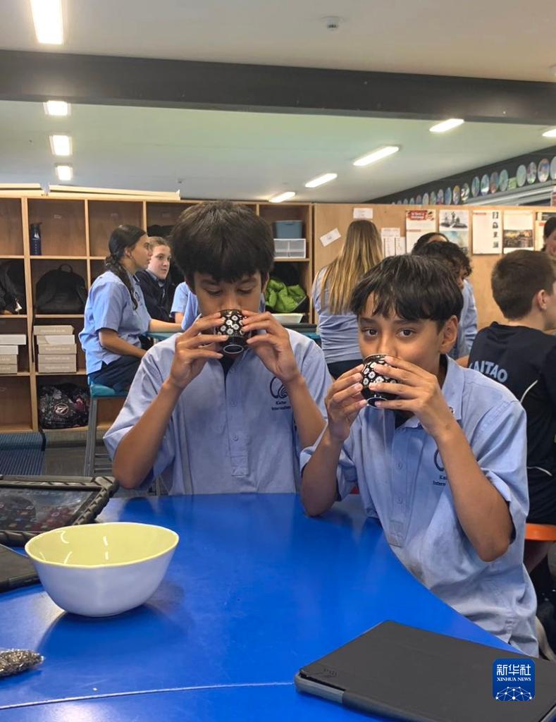 5月10日,学生在新西兰北岛中部的罗托鲁阿凯滔中学品尝中国茶。新华社发(胡敏瑶 摄)