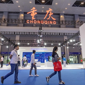 18日,观众从“西洽会”重庆馆前走过。新华社记者黄伟 摄
