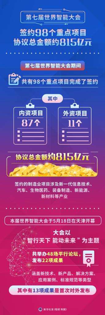 新华社天津5月20日电(记者王宁、郭方达)记者从天津市工信局了解到,第七届世界智能大会期间,共有98个重点项目完成了签约,其中内资项目87个、外资项目11个,协议总金额约815亿元。签约的制造业项目涉及新一代信息技术、汽车、生物医药、装备制造、新能源、新材料等产业。