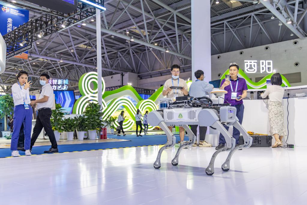 5月18日,工作人员在西洽会上展示应用于地下电缆隧道巡检的机器狗。新华社记者 黄伟 摄