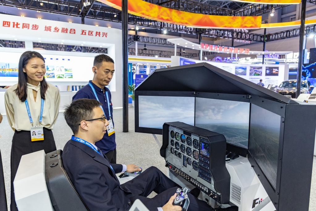 5月18日,在西洽会的四川馆,观众在体验科普级飞行模拟体验舱。新华社记者 黄伟 摄