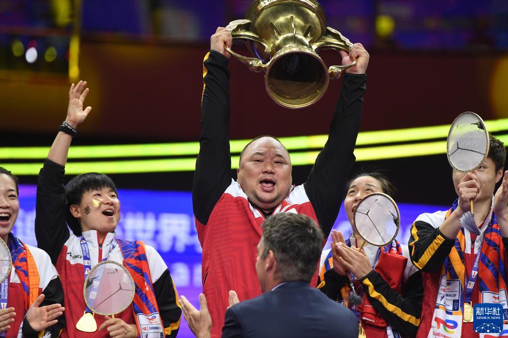 5月21日,中国羽毛球协会主席张军(中)在颁奖仪式上举起苏迪曼杯。
