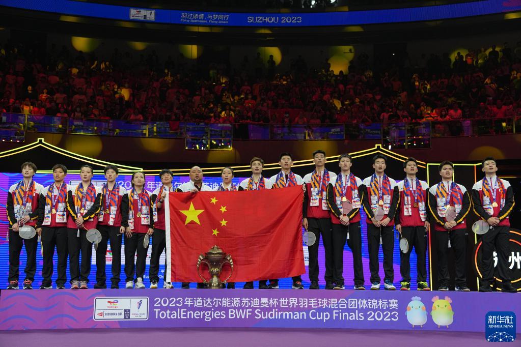 当日,2023年苏迪曼杯世界羽毛球混合团体锦标赛颁奖仪式在江苏省苏州市举行。中国队在决赛中以3比0战胜韩国队,夺得冠军。