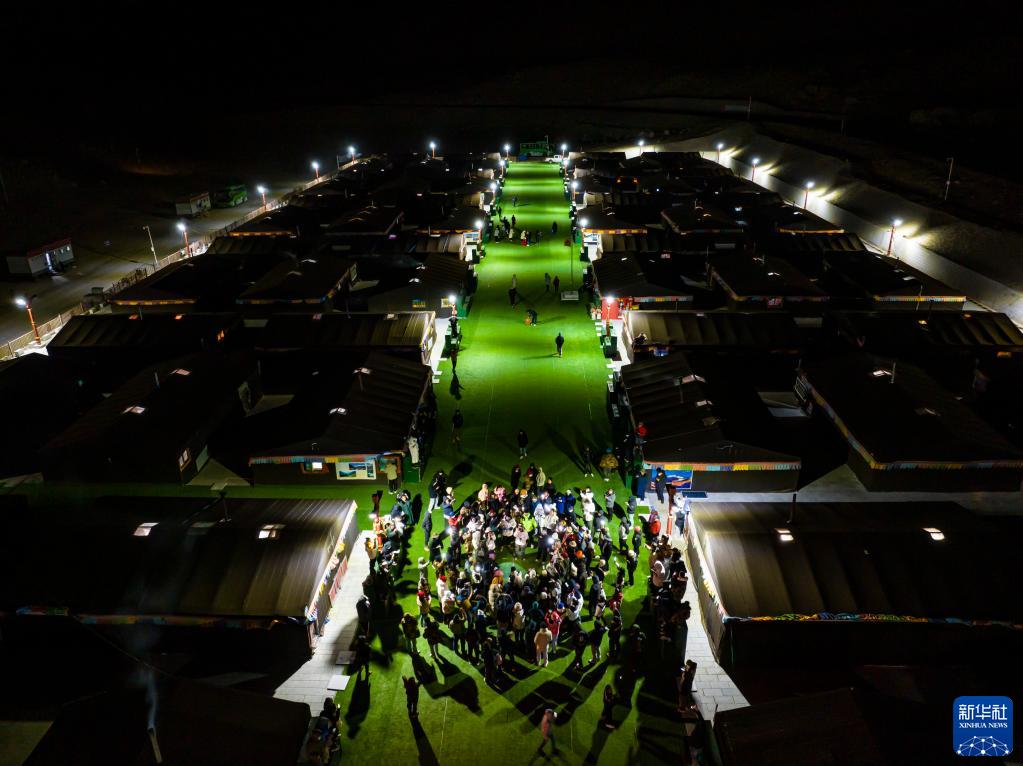 在珠峰游客大本营,游客在帐篷旅馆间的空地上唱歌跳舞(5月16日摄,无人机照片)。新华社记者 孙非 摄
