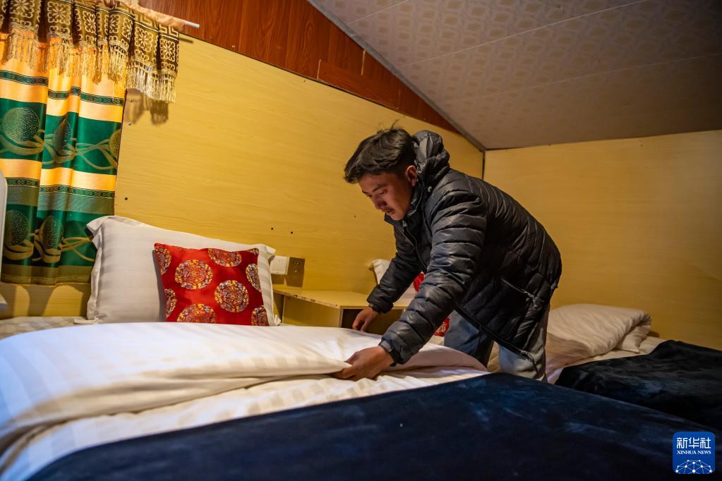 在珠峰游客大本营的帐篷旅馆,旦增在整理床铺(5月13日摄)。新华社记者 孙非 摄