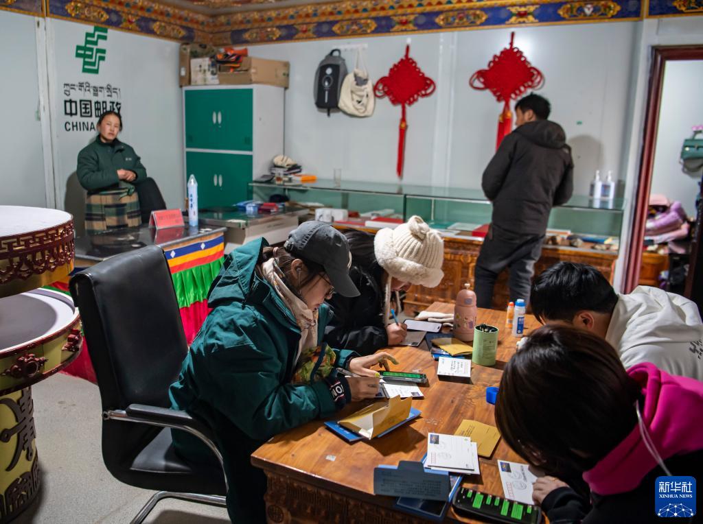 在珠峰游客大本营的邮政所,游客在写明信片(5月13日摄)。新华社记者 孙非 摄