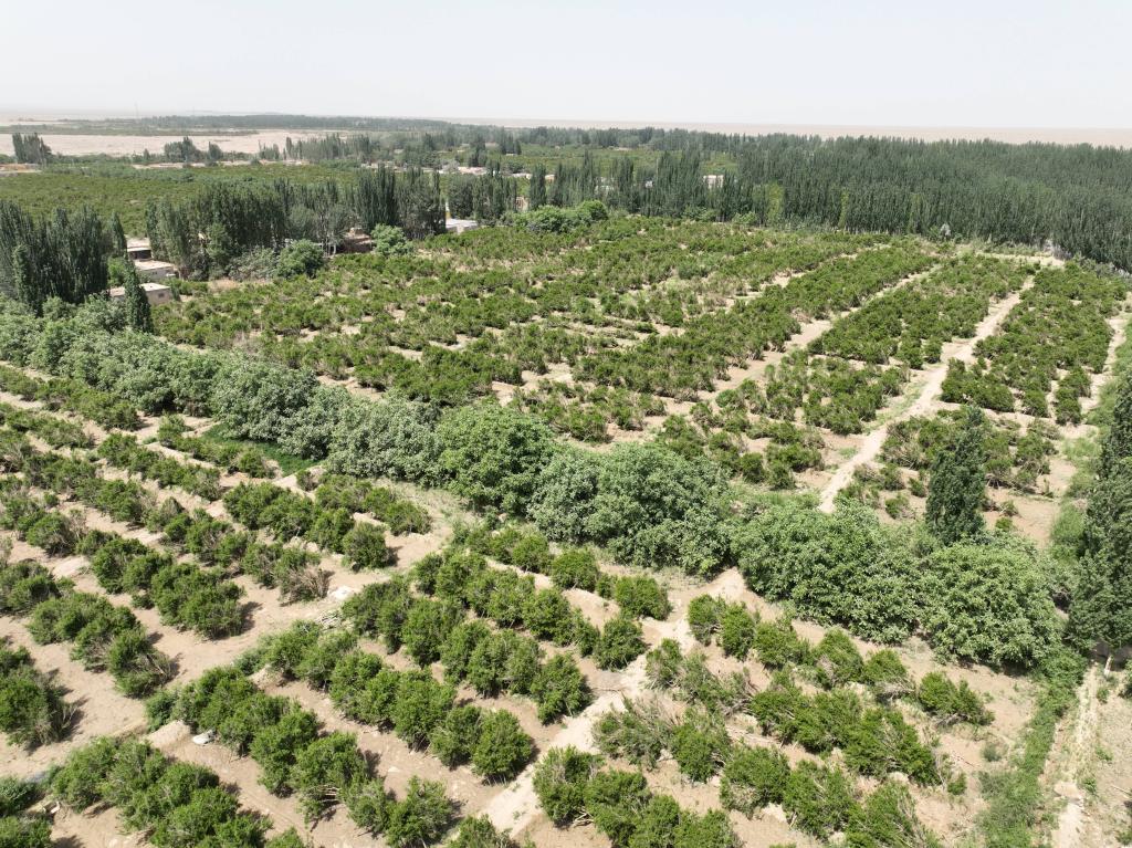 图为新疆和田地区皮山县皮亚勒玛乡兰干库勒村的石榴种植园(无人机照片)。新华社记者赵晨捷 摄
