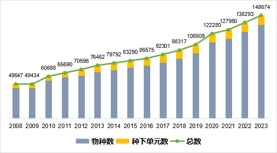 《中国生物物种名录》2023版共收录物种及种下单元148674个,其中,动物部分69658个,植物部分47100个,真菌界25695个,原生动物界2566个,色素界2381个,细菌界469个,病毒805个。