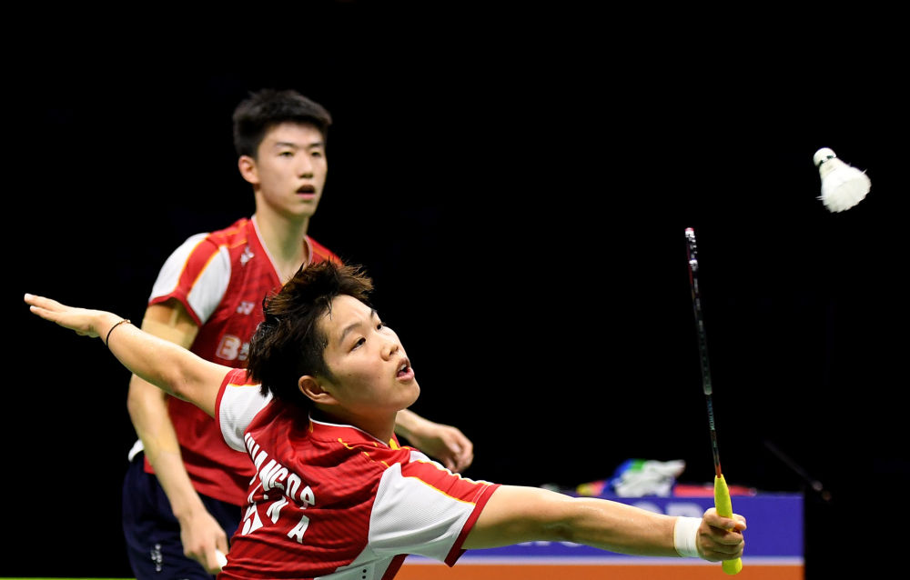 5月20日,中国队组合冯彦哲/黄东萍(前)在混双比赛中。新华社记者 侯昭康 摄