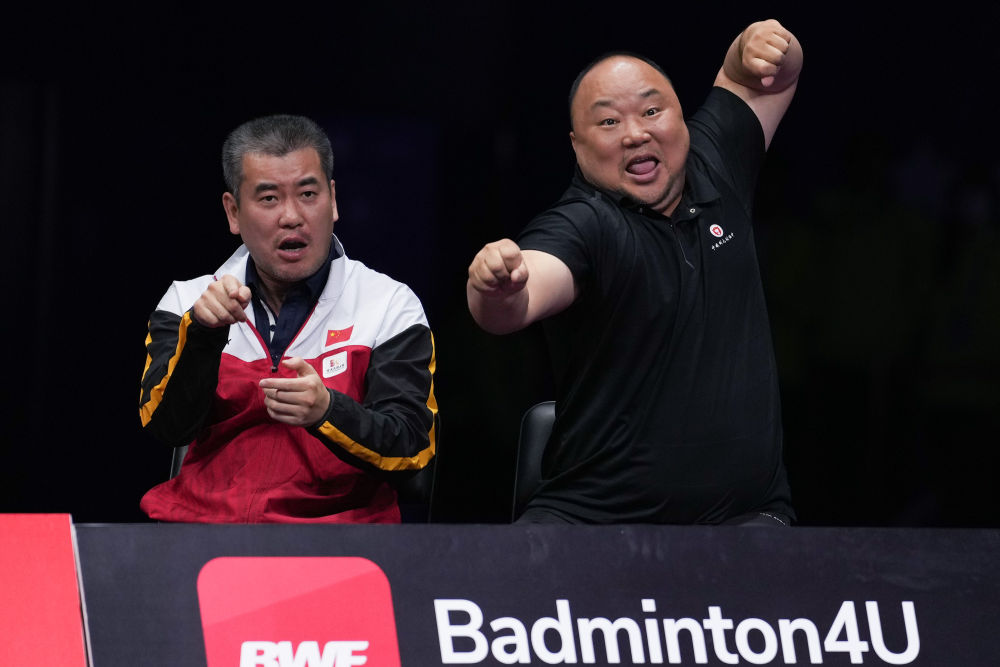 5月20日,中国羽毛球协会主席张军(右)在场边为球员加油。新华社记者 李博 摄