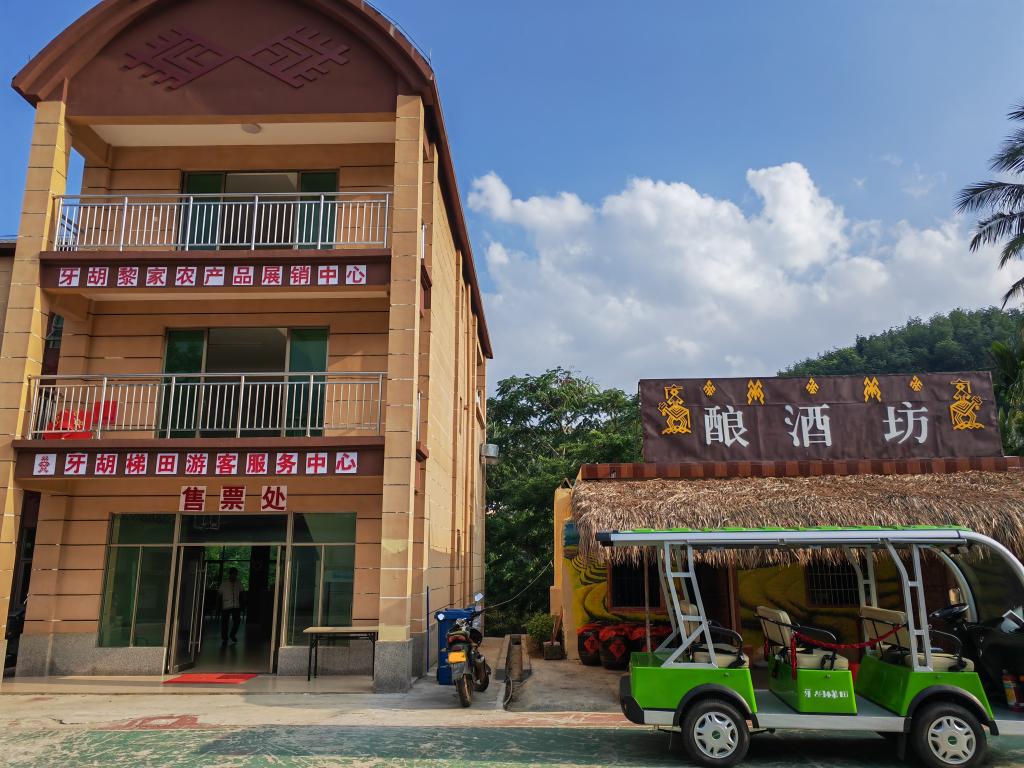 记者在牙胡村看到,村口设有保安亭、停车场,村委会对面是一栋黎族民居特色的游客服务中心及农产品展销中心,门前停放着8辆电瓶车,正在各处忙碌的村干部和村民身着黎族服饰。