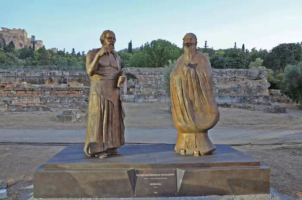 2021年9月,著名雕塑家、中国美术馆馆长吴为山青铜组雕作品《神遇——孔子与苏格拉底的对话》在希腊雅典揭幕。图片由中国美术馆提供