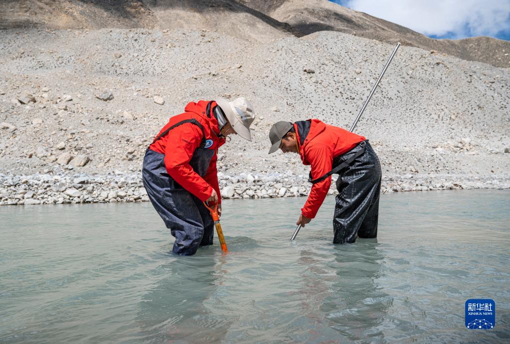 在珠峰登山大本营附近,来自西藏大学生态环境学院的科考队员在收集水生生物样本(5月22日摄)。