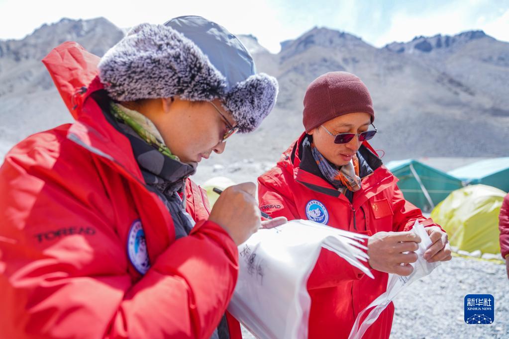 在珠峰登山大本营,中国科学院西双版纳热带植物园研究员苏涛(右)和同事在样品自封袋上做标记(5月14日摄)。