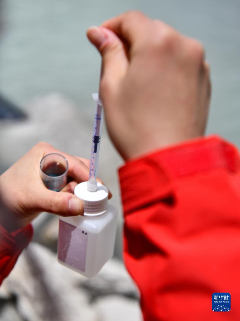 在珠峰海拔约5300米处,来自中国科学院青藏高原研究所的科考队员邱海英在对冰前湖水样滴定碳酸氢根浓度(5月12日摄)。