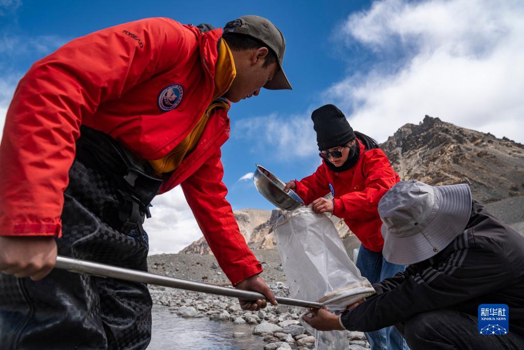 在珠峰登山大本营附近,来自西藏大学生态环境学院的科考队员在采集水生生物样本(5月22日摄)。