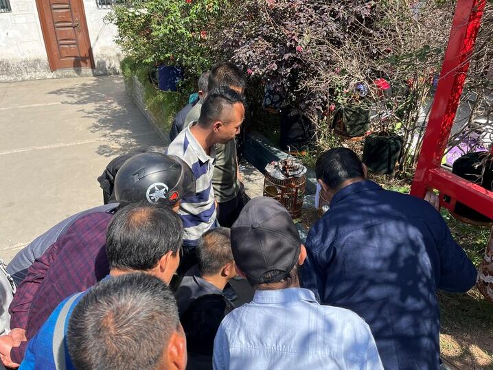 4月16日,贵州省黔东南州某县城广场一角,几名群众正在围观斗鸟。新华社记者蒋成 摄