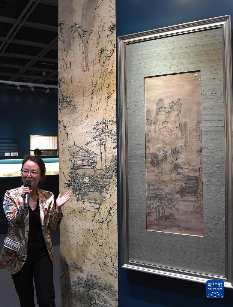 5月24日,在香港会议展览中心,工作人员讲解拍品明代画家仇英的作品《仙山楼阁》。新华社记者 陈铎 摄