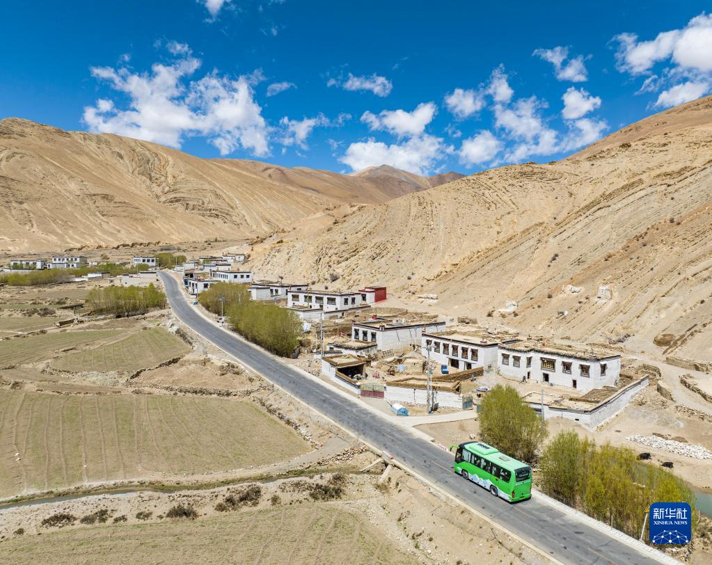 一辆载有游客的环保大巴车正驶向珠峰(5月25日摄,无人机照片)。新华社记者 孙非 摄