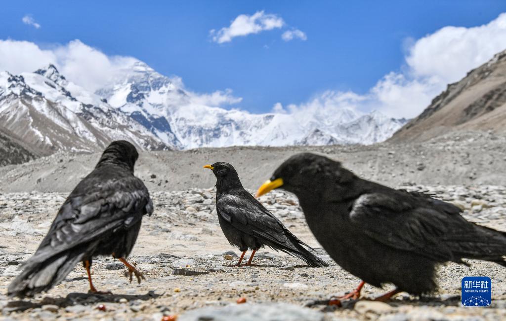 黄嘴山鸦在珠峰脚下觅食(5月14日摄)。新华社记者 晋美多吉 摄