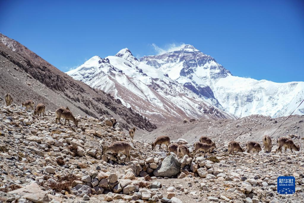 一群岩羊在珠峰脚下觅食(5月9日摄)。新华社记者 孙非 摄