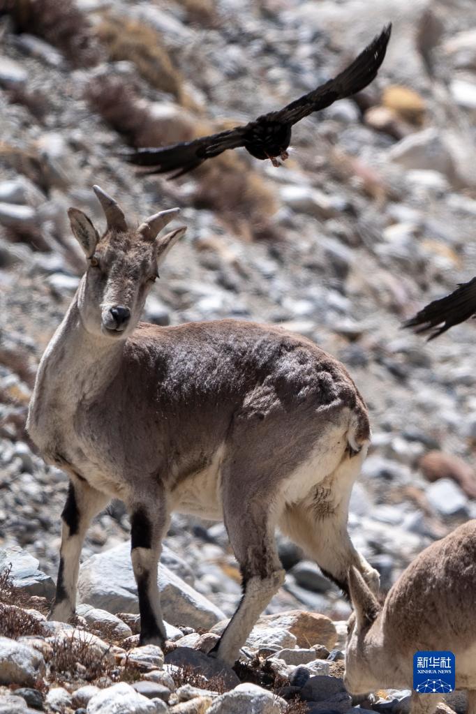 这是在珠峰国家级自然保护区内拍摄的岩羊和黄嘴山鸦(5月13日摄)。新华社发(旦增努布 摄)