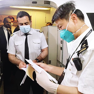 乌鲁木齐地窝堡机场海关关员正在登临检查收取航空器总申报单等单证。(受访单位供图)