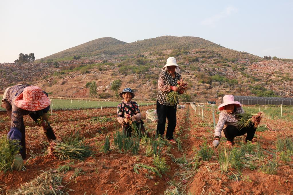 在弥泸灌区泸西县中枢片区,当地百姓正在采收香葱。新华社记者刘诗平 摄