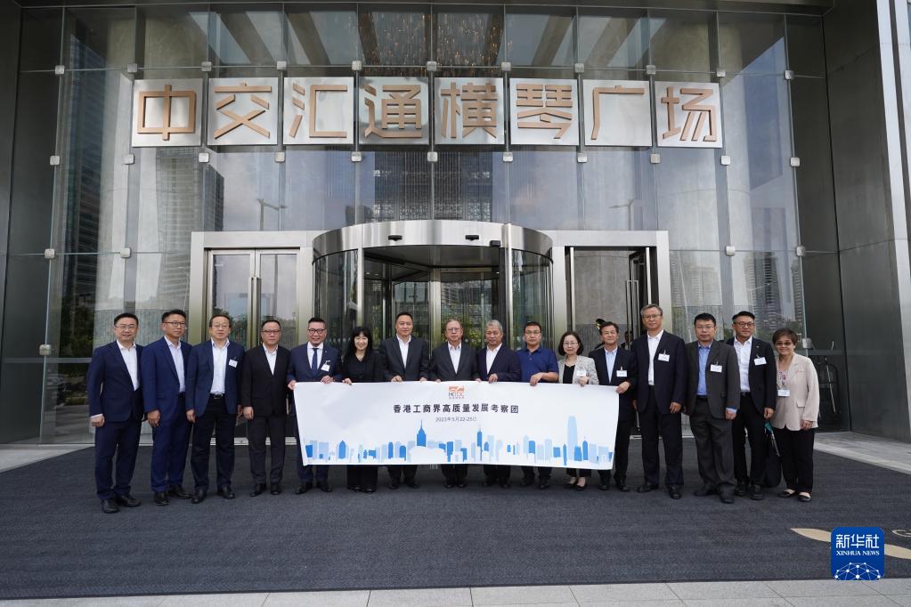 5月22日,考察团在珠海市中交汇通横琴广场前合影。新华社发