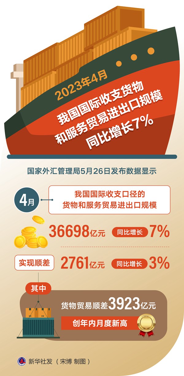 新华社北京5月26日电(记者刘开雄)国家外汇管理局26日发布数据显示,4月我国国际收支口径的货物和服务贸易进出口规模36698亿元,同比增长7%,实现顺差2761亿元,同比增长3%。