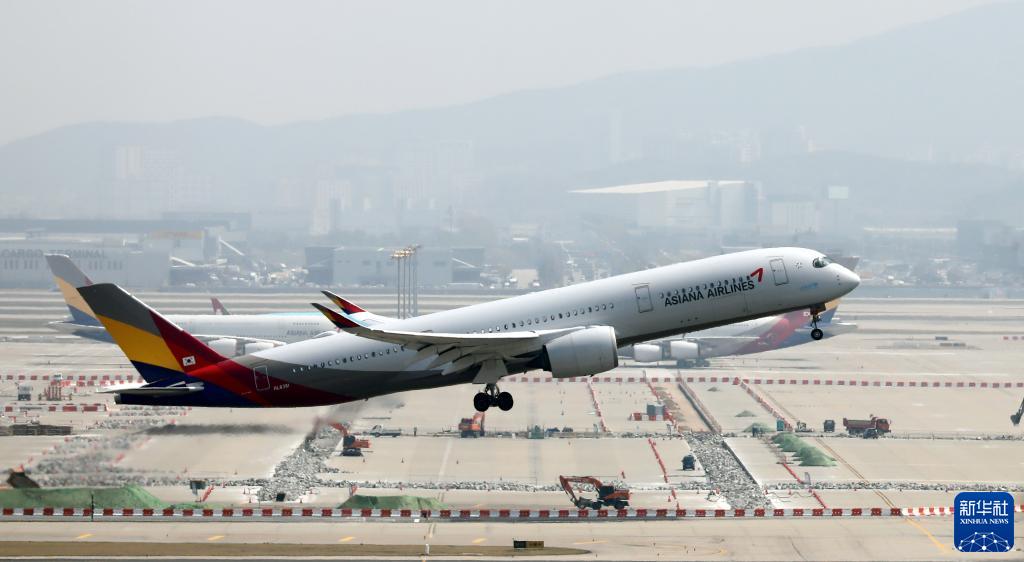 这是2022年4月19日拍摄的韩亚航空一客机从韩国仁川国际机场起飞的资料照片。