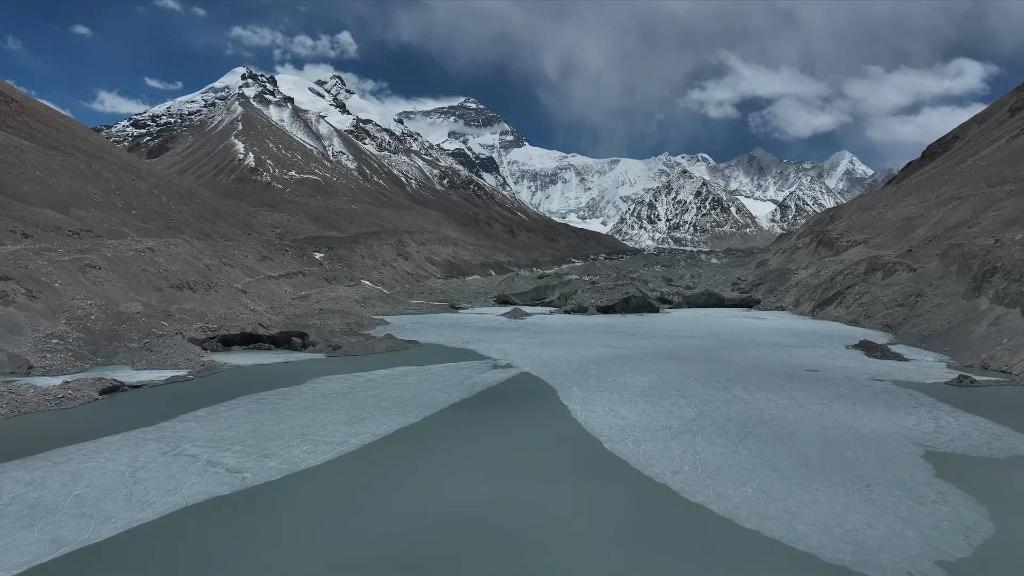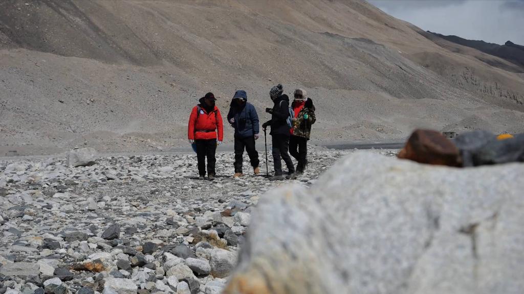 在海拔5200米的登山大本营附近的绒布河进行完检测后,科考人员一行计划前往约三公里外的中绒布冰川末端的冰湖,采集冰川融水样本并检测水质。