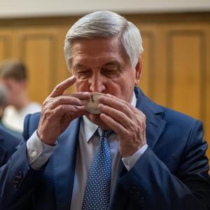 5月24日,在俄罗斯莫斯科的国家杜马大楼,俄中友好协会主席、俄罗斯国家杜马(议会下院)第一副主席伊万·梅利尼科夫(中)品味来自中国云南的茶。新华社记者 孟菁 摄