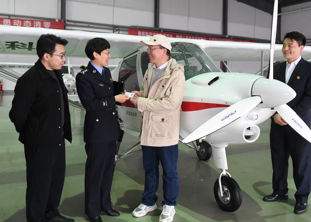 浙江绍兴:营造良好涉外营商环境。2022年11月22日,在新昌县万丰航空特色小镇,当地出入境管理大队工作人员为一名英籍华人专家(右二)送去永久居留证。新华社记者翁忻旸摄