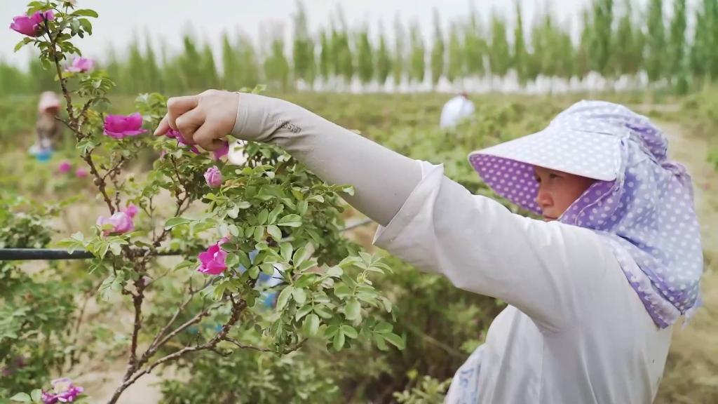 5月,位于新疆塔克拉玛干沙漠南缘的和田地区,玫瑰花、石榴花等“致富花”纷纷盛开在田间地头,当地农民采摘玫瑰花提炼成玫瑰精油、制作成玫瑰花酱等来增收致富。石榴地里,农民松土修枝,期盼秋天能结出好果实,卖出好价钱。