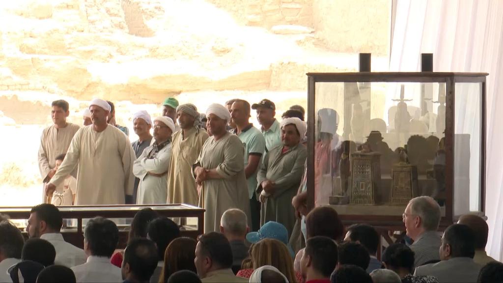 埃及旅游和文物部在新闻发布会上还公开了新发现的两座古埃及墓葬,以及从墓葬中出土的棺椁和陪葬品。瓦齐里说,一座墓葬属于古埃及第五王朝,另一座属于第十八王朝,墓主均为古埃及祭司。记者在现场看到,墓葬紧邻木乃伊作坊,墓室内外的墙壁上有精美壁画与浮雕,公开展示的木乃伊棺椁颜色鲜艳,上面绘制着复杂纹饰与古埃及象形文字。