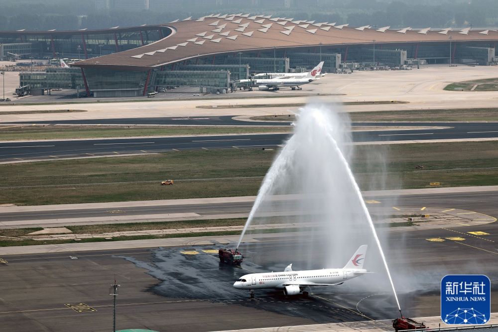 5月28日,C919首个商业航班东航MU9191在北京首都国际机场平安降落。新华社发(汪洋摄)