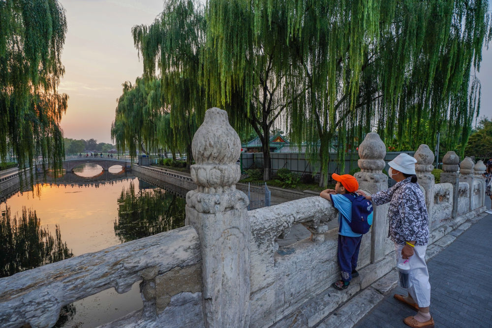 市民在京杭大运河和北京中轴线交汇点的万宁桥上眺望什刹海(2022年9月28日摄)。新华社记者 陈钟昊 摄