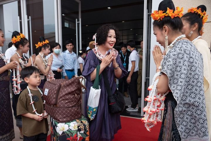 在中老铁路老挝磨丁站,工作人员欢迎乘坐D887次国际旅客列车的旅客抵达磨丁(2023年4月13日摄)。新华社发(凯乔 摄)