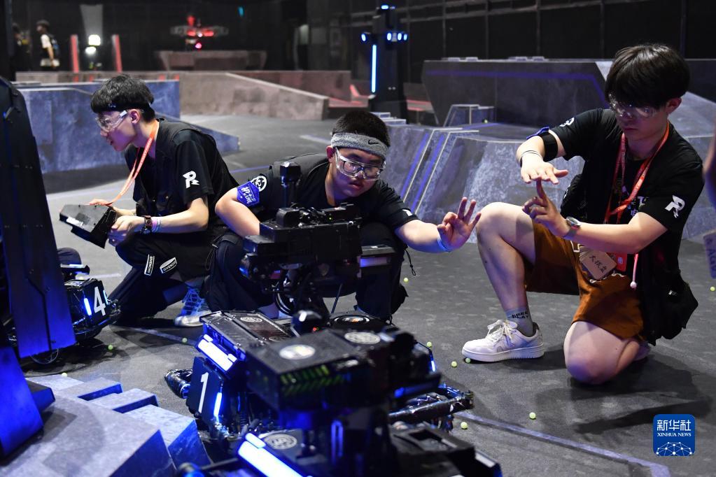 5月28日,大连交通大学TOE战队队员在比赛间隙调试机器人。