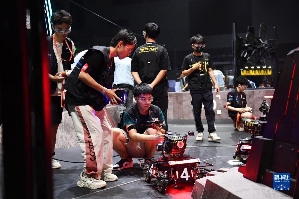 5月28日,深圳大学RobotPilots战队队员在比赛前调试机器人。