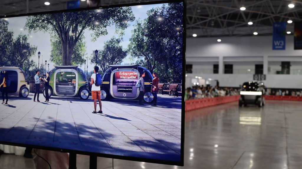 观众大排长龙想化妆?实际是体验利用AI设计算法和大型金属3D打印技术设计与制造的无人驾驶移动美妆车。