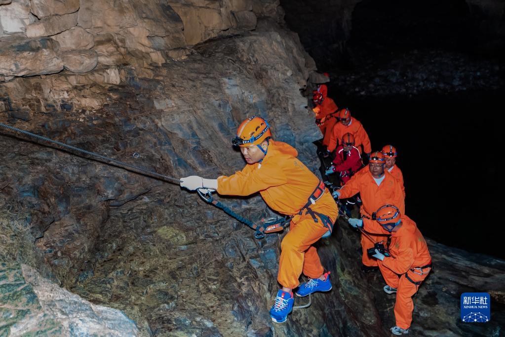 游客在贵州省绥阳县地下裂缝景区体验洞穴探险(5月17日摄)。