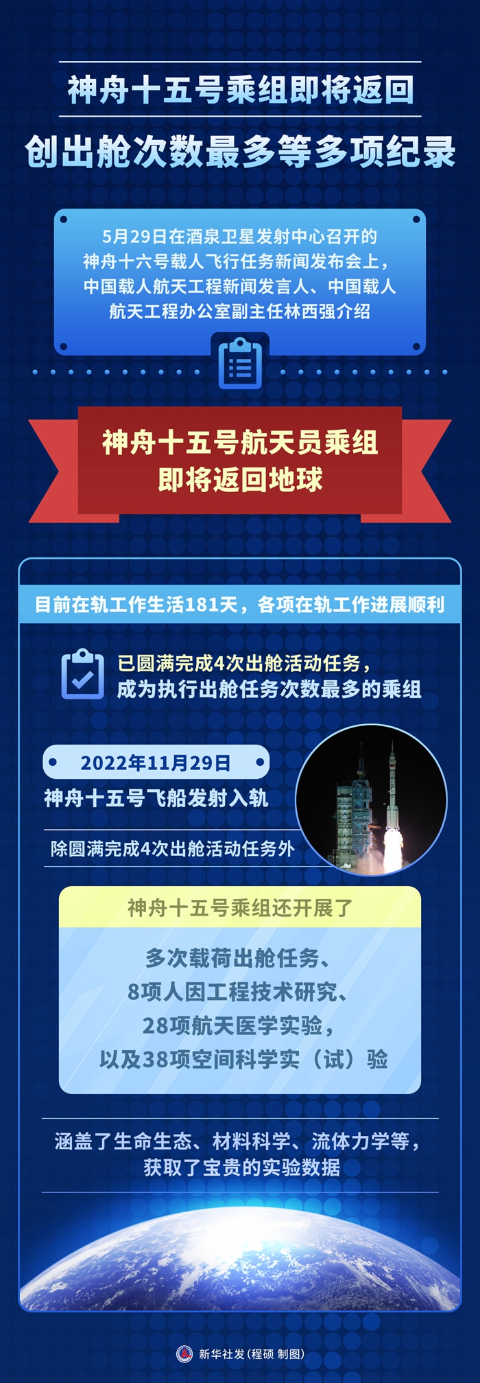 新华社酒泉5月29日电 5月29日在酒泉卫星发射中心召开的神舟十六号载人飞行任务新闻发布会上,中国载人航天工程新闻发言人、中国载人航天工程办公室副主任林西强介绍,神舟十五号航天员乘组即将返回地球,目前在轨工作生活181天,各项在轨工作进展顺利,已圆满完成4次出舱活动任务,成为执行出舱任务次数最多的乘组。