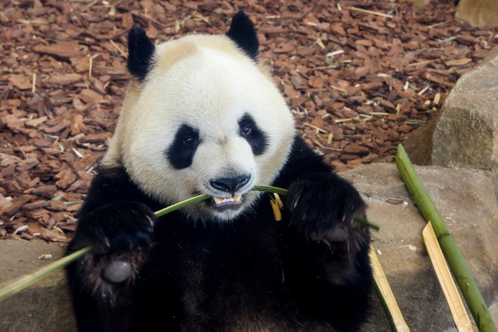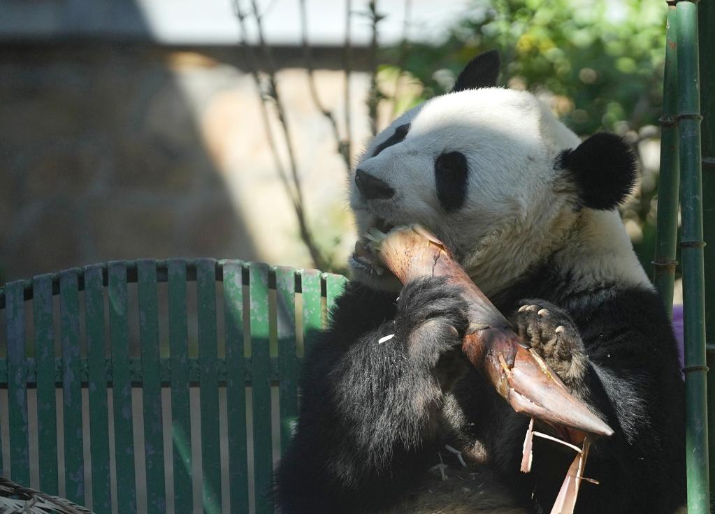 大熊猫“萌兰”在吃竹笋。新华社记者 鞠焕宗 摄