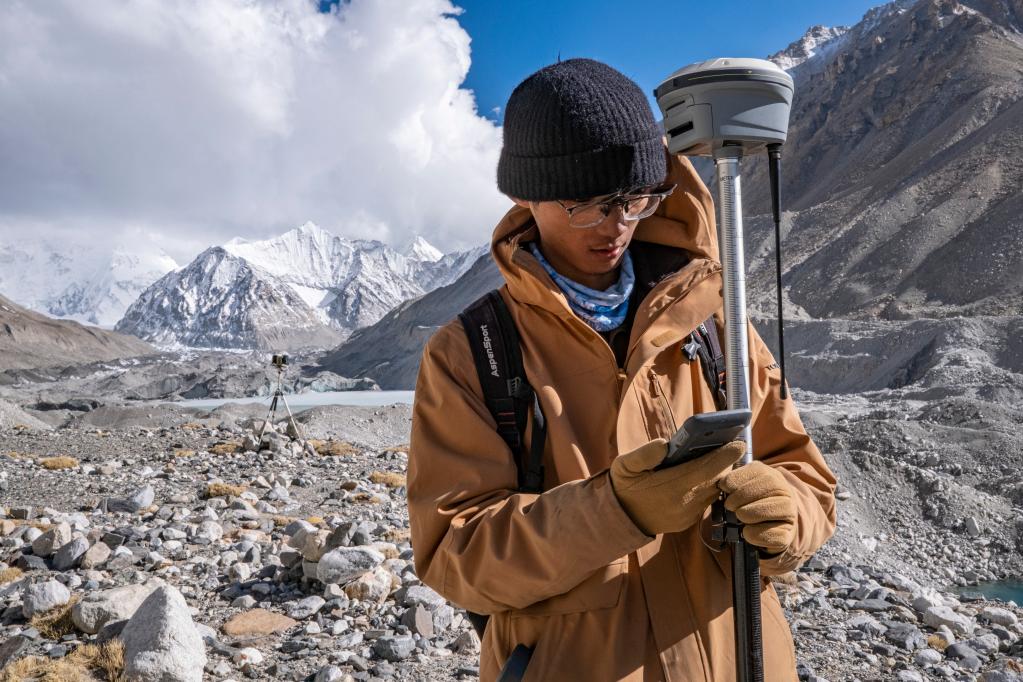 在珠峰海拔约5300米处,来自中国科学院西北生态环境资源研究院的科考队员薛雨昂在对冰川进行实时差分GPS定位(5月15日摄)。新华社记者孙非 摄