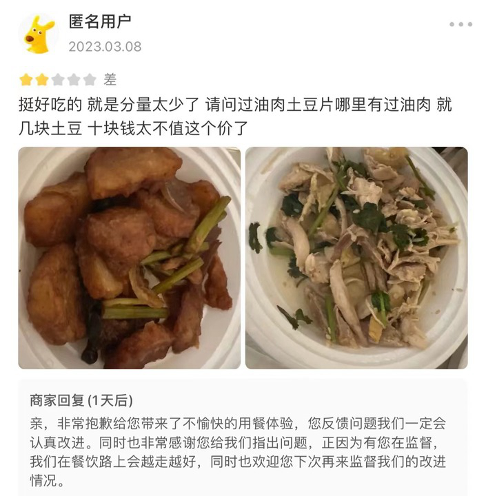 太原市万象城、亲贤街多家餐饮企业经营者表示,“同等条件下,消费者消费大份菜、一份菜价格要低于两份小份菜、半份菜的价格之和,一些消费者认为不划算,让小份菜、半份菜推广面临困难。”在某外卖平台,记者浏览发现,一些给予差评的消费者评价留言称,小份菜的分量和价格不成正比、“量少价贵”等。